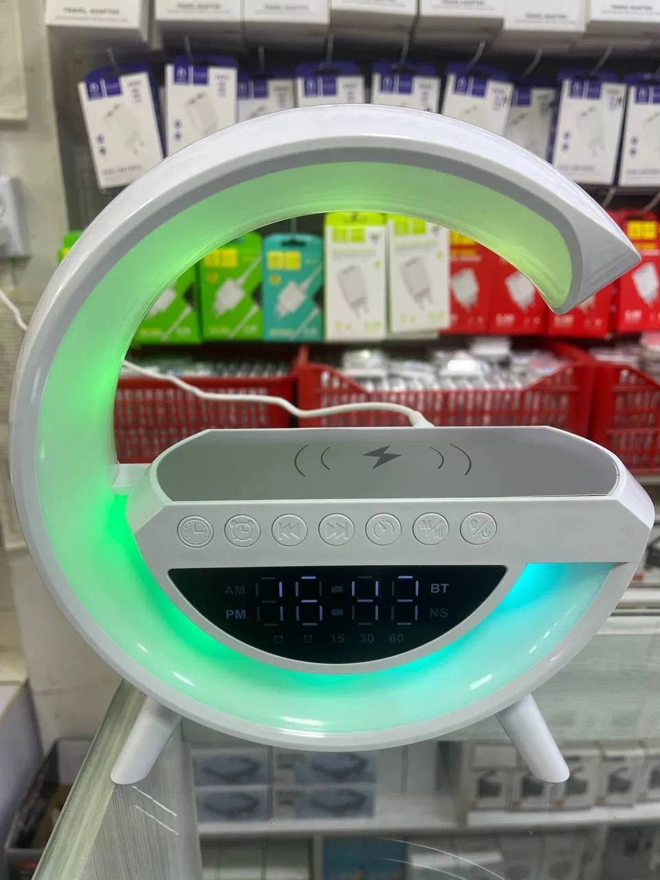 ✨ 3-in-1 Aqlli Stol Chirog‘i ✨ Zamonaviy dizayn Simsiz zaryadka (Wireless charging) Bluetooth karnay Elektron soat + budilnik LED yorug‘lik (yumshoq, ko‘zni charchatmaydi)